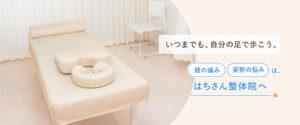 はちさん整体院では、「ずっと自分の足で歩けるからだ」を目指す、をコンセプトに施術・メンテナンスを通してご自身の体の状態を知り、向き合い、症状の改善とともに皆さんが一歩ずつ前に踏み出し、好きなことを楽しむ生活が送れるようにサポートしていきます。