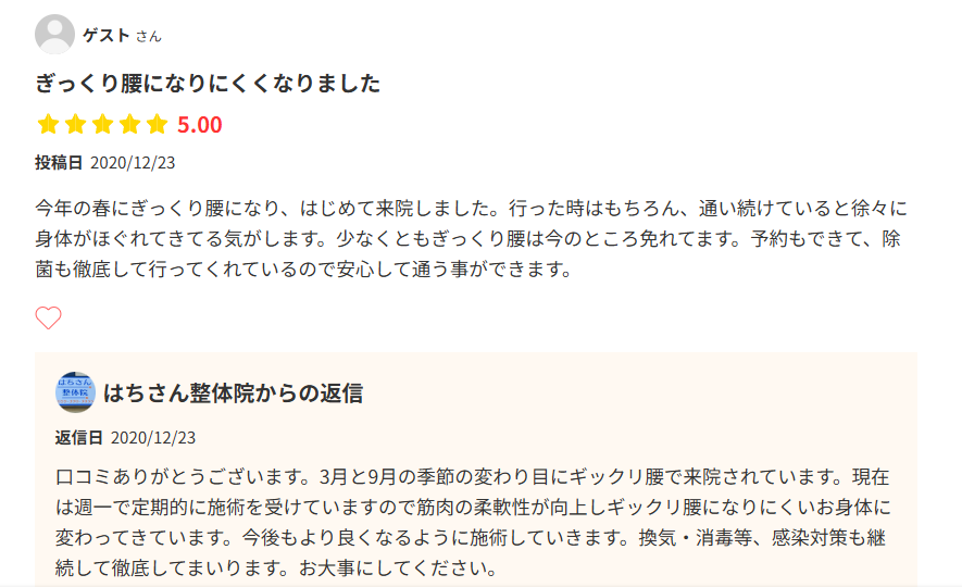 HOME > 口コミ(腰痛) > 四日市市にお住いの30代男性から腰痛改善の口コミをいただきました。 2026年2月22日 2020年の口コミですが、最近ギックリ腰で来院される方が増えているので紹介させていただきます。 2020年に頂いた口コミですが、季節の変わり目の近頃はギックリ腰(急性腰痛)で来院される方が多くいらっしゃいますので、紹介させていただきました。当院の根本的な考え方は変わらず、患部の痛みが強いときは股関節や足部(足首・足の裏)からアプローチをして症状を改善するための施術をしていきます。 四日市市(四日市北部)・桑名市で腰痛・膝痛でお悩みのかたはお気軽にご相談ください。 Post Share Pocket Hatena Pinterest LINE コメント URLコピー -口コミ(腰痛)